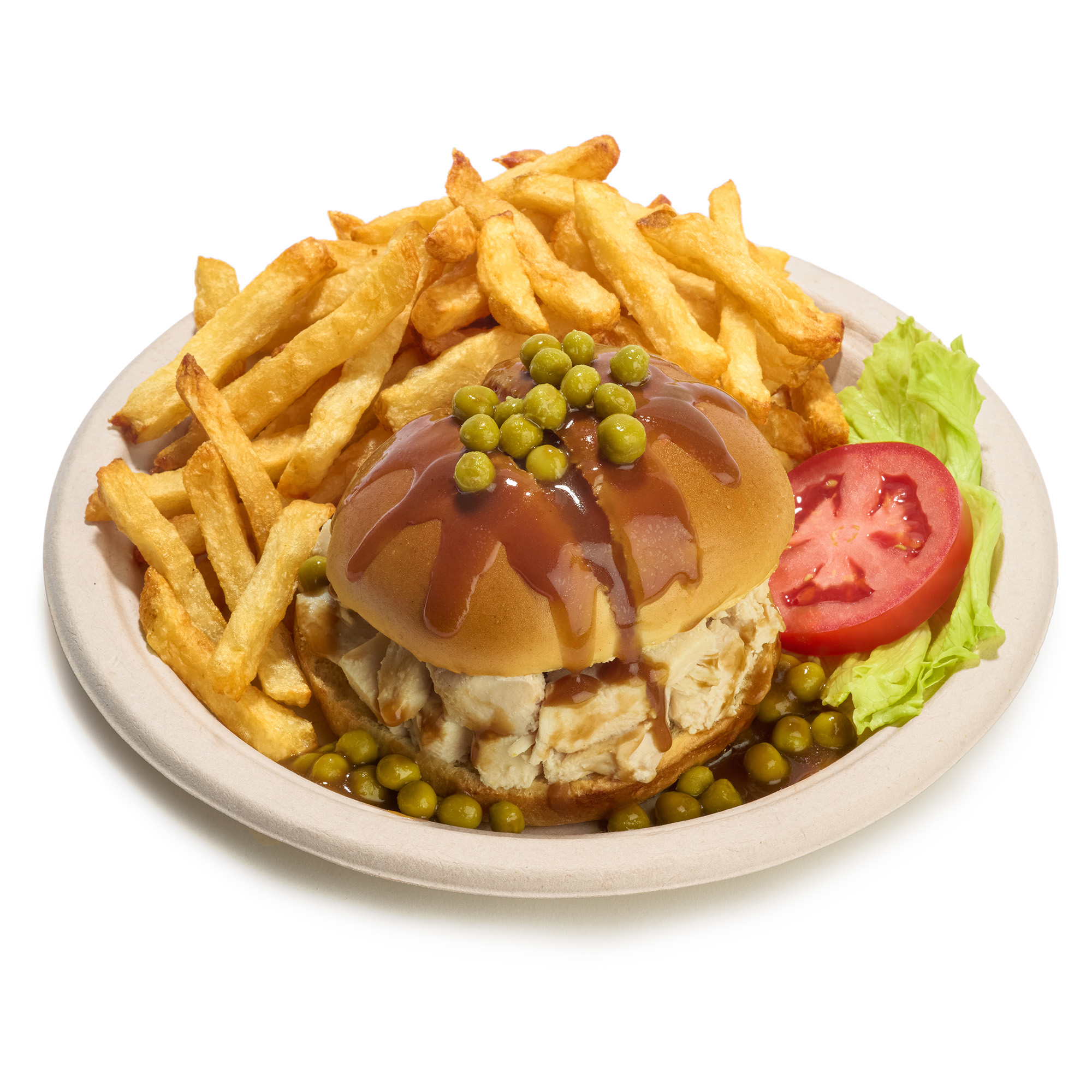 Ce plat réconfortant célèbre la simplicité bien faite : deux boulettes de bœuf haché généreuses, couronnées d’oignons frits croustillants et nappées d’une riche sauce brune maison. Servi avec des frites dorées, accompagné de laitue, de tomates et de petits pois, apportant fraîcheur et équilibre à l’ensemble. Un incontournable qui traverse les générations avec gourmandise.