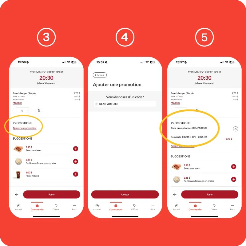 3. Ajouter le code promo REMPARTS30 dans la section PROMOTIONS;